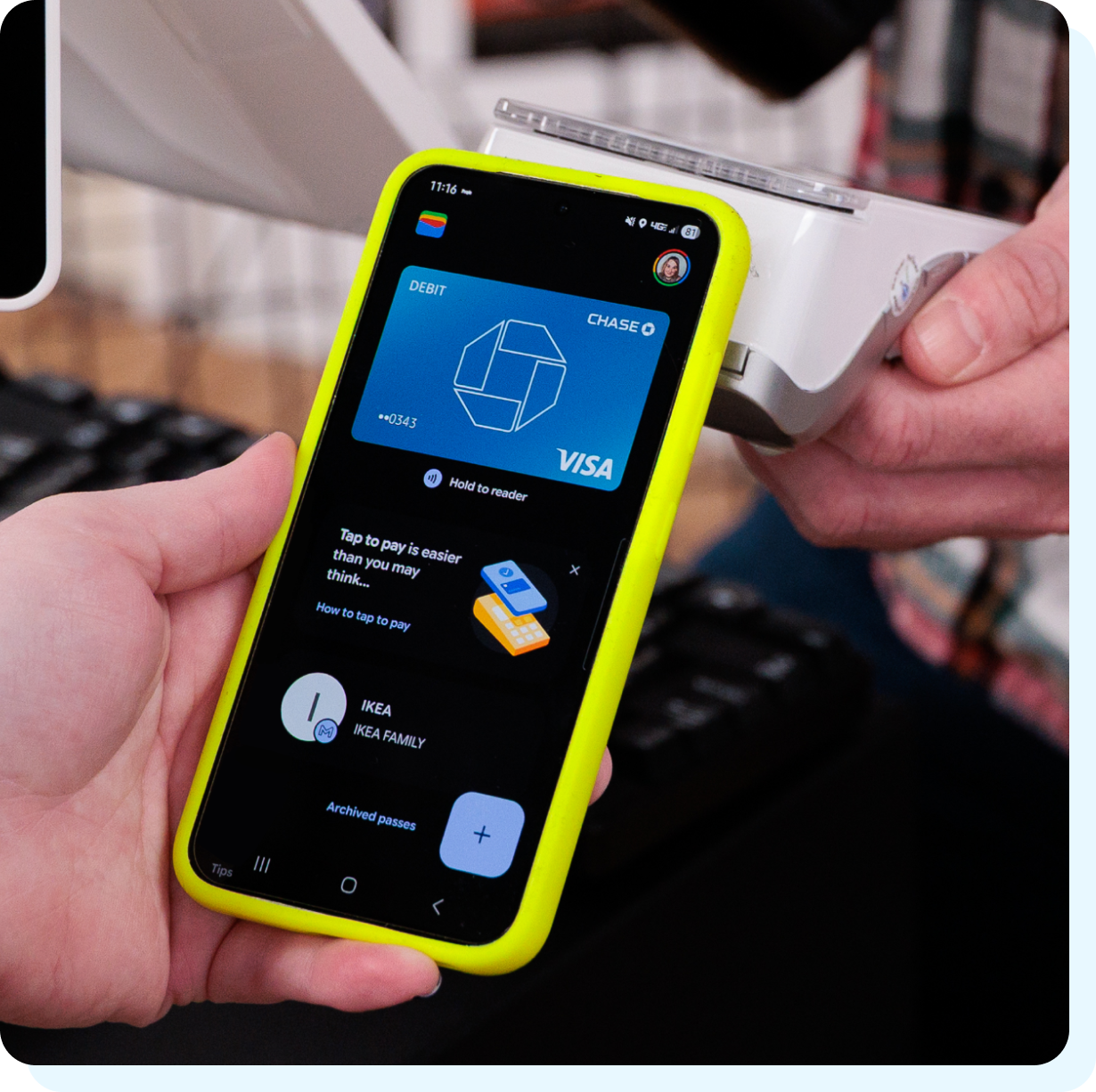 1. They tap, swipe, or insert their card—or use a mobile wallet.